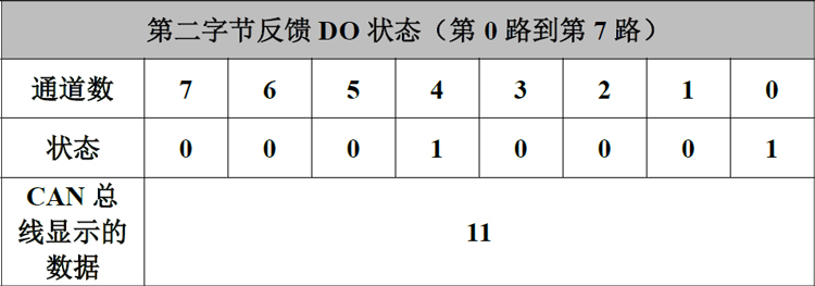 2)反馈的输出状态由第2个字节来表示,该字节用于反馈第0到7输出通道的状态,其中输出通道7处于高位,输出通道0处于低位。