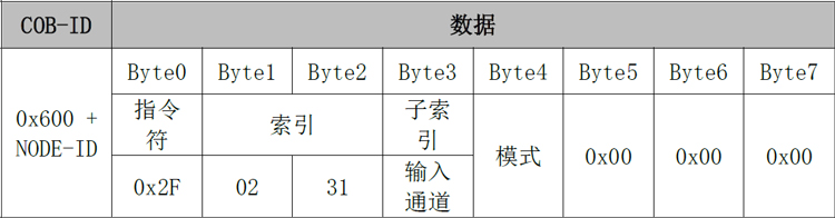 GCAN-6057模块可通过发送SDO命令写参数,修改模块的ID。模块的ID位于对象字典索引0x3100、子索引0x00,数据类型Unsigned8。