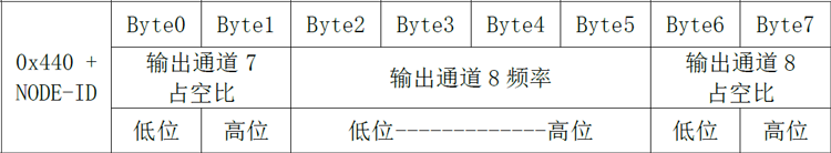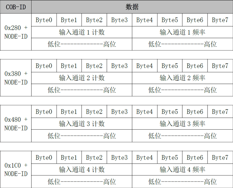 GCAN-6057模块发出的TPDO数据帧时,1个输入通道的数据长度为8字节,其中前4字节为计数,后4字节为频率: