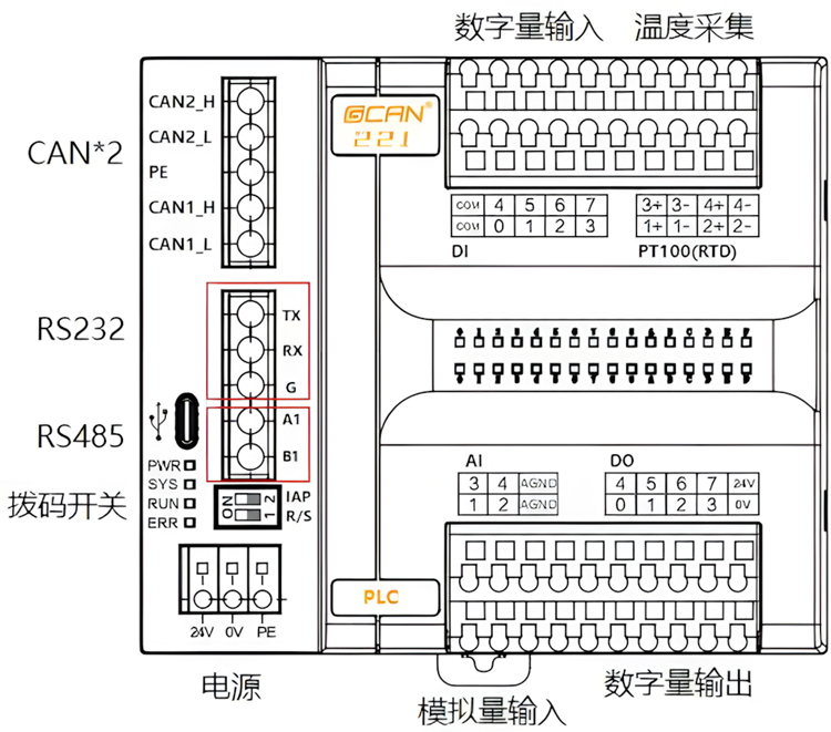 GCAN-PLC-221设备包含1个电源接口,一个USB-Type C接口,2路CAN通信接口,1路RS485通信接口,1路RS232通信接口,4路AI接口;4路PT100接口;8路DO接口,8路DI接口。控制器编程接口使用USB接口,接口定义如下表所示。