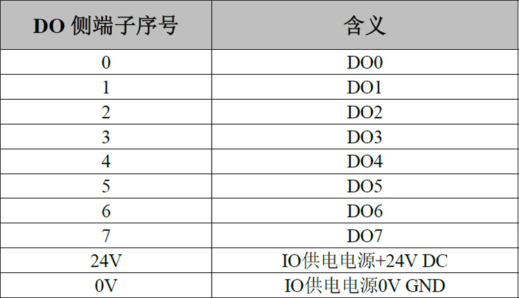 GCAN-PLC-221的主控模块右侧顶板含有上下四排端子排,下方两排端子排的右侧为DO端子排,分别为DO0~DO7共8个数字量输出点,以及1组IO供电电源接口(IO供电电源已与系统电源隔离,IO模块需供电后才能正常工作),如图所示。各个端子对应的序号及其含义如表2.4所示。