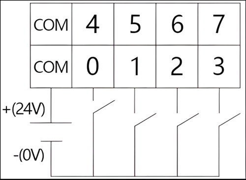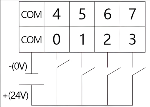 上方两排端子为DI端子排,分别为DI0~DI7,DI8~DIF共16个数字量输入点,以及4个DI的COM接口(4个COM口内部已短接,任意连接1个即可),如图所示。各个端子对应的序号及其含义如表2.5所示。