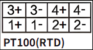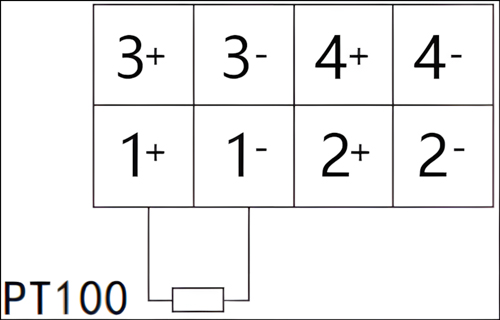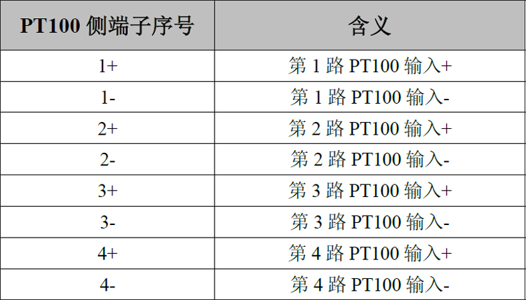 上方两排端子排的右侧为PT100端子排,分别为R1±到R4±,如图所示。端子对应的序号及其含义如表2.7所示。