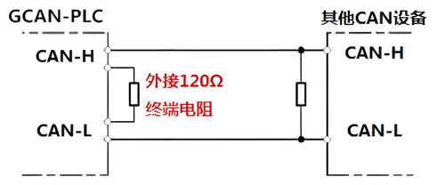请注意:GCAN-PLC-221的CAN总线内部未集成120Ω终端电阻。如果节点数目大于2,中间节点不需要安装120Ω的终端电阻。需要使用时,将电阻两端分别接入CAN_H、CAN_L即可,如图3.3所示。