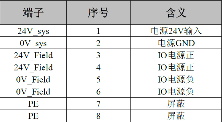 表2.1 GCAN-IO-8200 EtherCAT总线耦合器模块电源接线端子定义