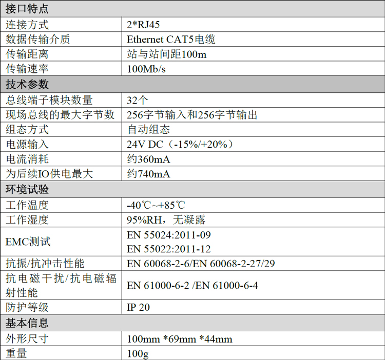 ● 2个EtherCAT总线接口,EtherCAT/IN和EtherCAT/OUT(RJ45);● 总线传输速率:100Mbps;● 总线传输距离(站与站间距):100m;● 在电源供应充足(加扩展电源模块)情况下可扩展IO模块数量最多为32个(最多32x8个DI/DO点);其中当扩展模块数量超过16片时,需额外增加一片上述的IO供电扩展模块GC 8012以保证电源供应充足;● 组态方式根据IO插片顺序组态;● 电源采用24V DC(-15%/+20%);● 电流消耗约360mA;● 为后续IO供电最大电流约740mA;● 电气隔离为1500 Vrms;● 工作温度范围:-40℃~+85℃;● 尺寸:长100mm*宽69mm*高48mm。