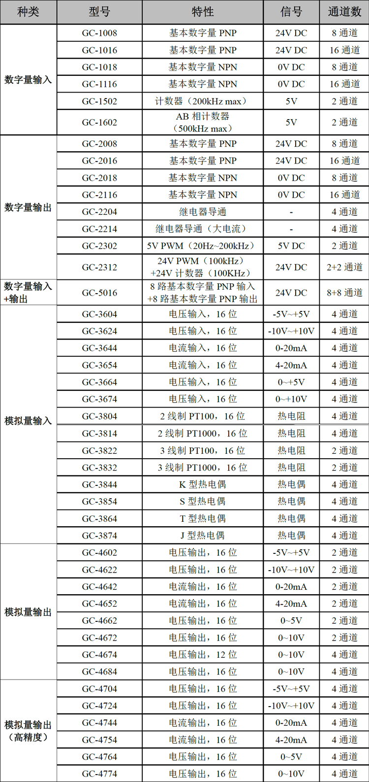 GC系列可编程控制器扩展模块目前包括:数字量输入扩展模块、数字量输出扩展模块、模拟量输入扩展模块、模拟量输出扩展模块四大类,具体的选型表如下表所示。