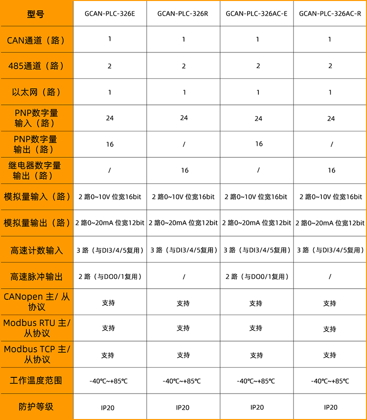 GCAN-PLC-326-E/R不仅可完成各种数字/模拟量的输入/输出,还集成了多种常用的工业现场总线,如:CAN总线、RS485总线、以太网总线,并支持常见的通信协议如:CANopen、Modbus RTU、Modbus TCP等。