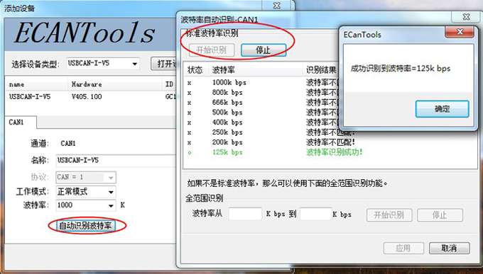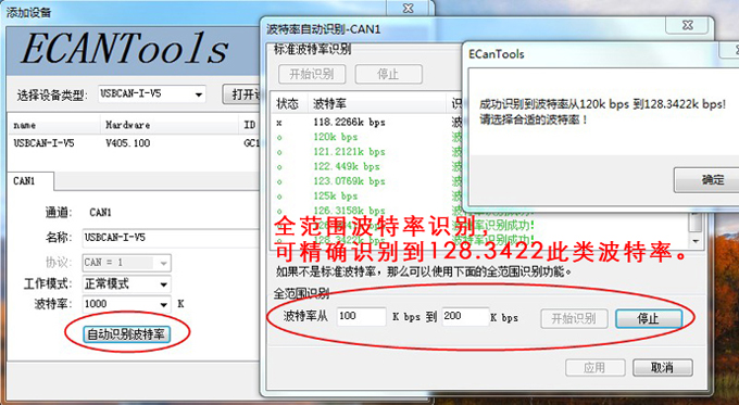 软件可以自动识别波特率,当用户在不知道总线波特率的时候,自动识别波特率功能会对用户有极大的帮助。识别波特率分为两种模式:标准波特率识别(通用波特率如1000K、800K、500K等)、全范围波特率识别(设置识别范围,全面匹配)