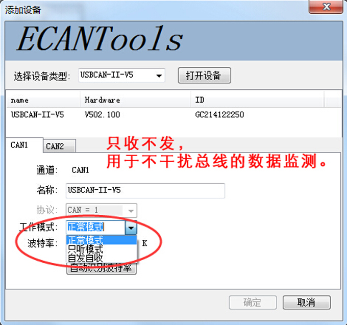 可以设置USBCAN只听模式,在这种模式下,设备只是接收can总线上的数据,不向总线发送回应数据包,适合于在正在运行的系统中,截获总线数据进行分析。