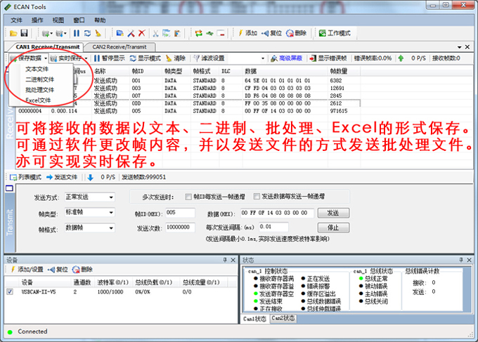 可将列表中的数据(实时)保存到电脑,可以有多种保存格式:文本文件(.txt)数据直观便于携带;二进制文件可以满足用户的特殊需求;批处理文件(.CAN)可以修改后发送回总线上;Excel文件可以使用excel打开,便于数据处理。